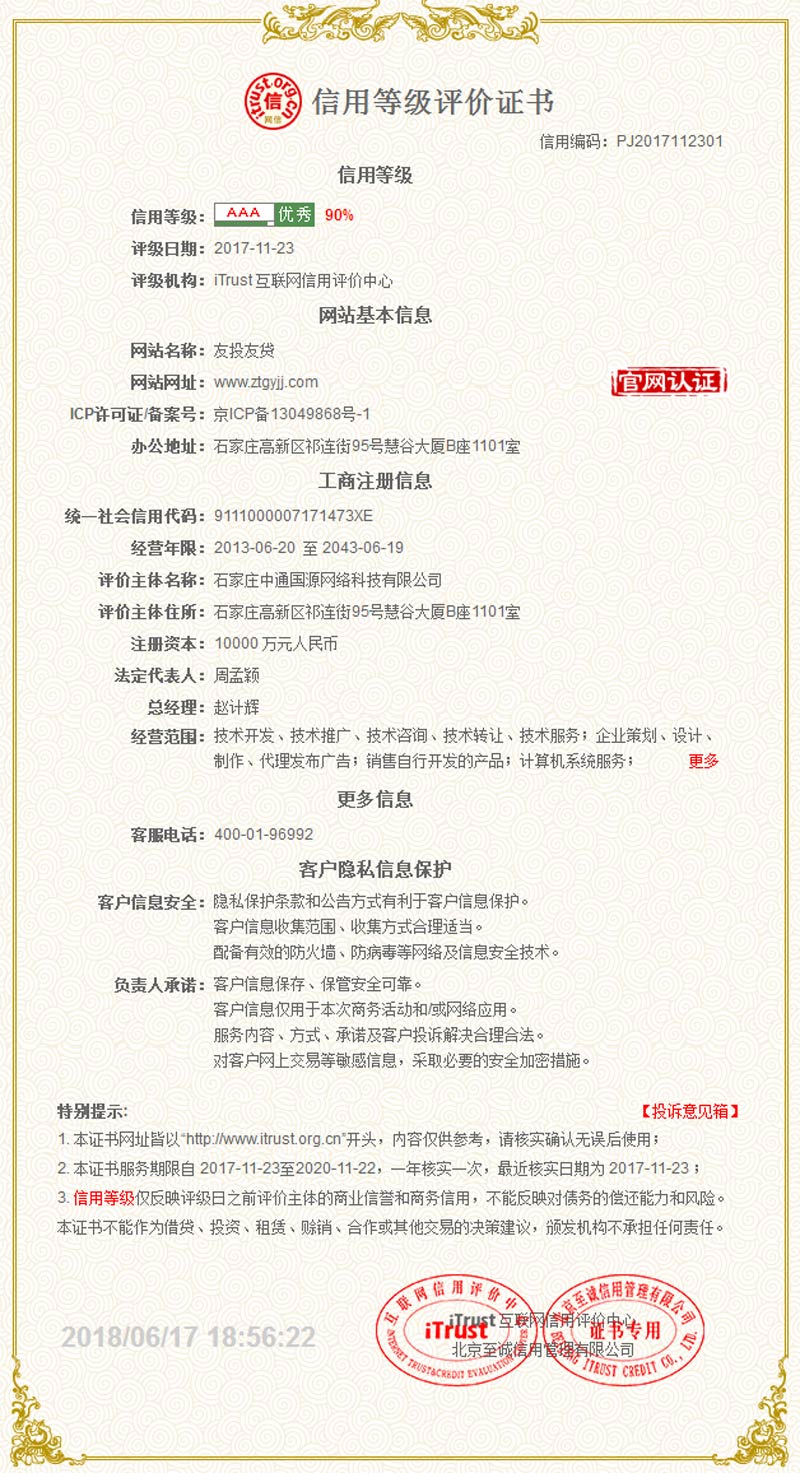 親愛的朋友們,中通國源線上出借平臺友投友貸這幾年不斷努力發(fā)展,得到了大家的肯定與支持。近期中通國源(北京)投資基金管理有限公司的企業(yè)信用評級升級了,AAA級。